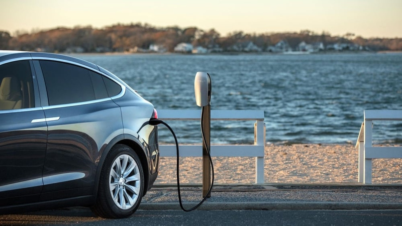 Black Tesla electric car charging at a Tesla charging station by the seaside with water and distant trees in the background, illustrating modern new cars and the growing trend of electric used cars.
