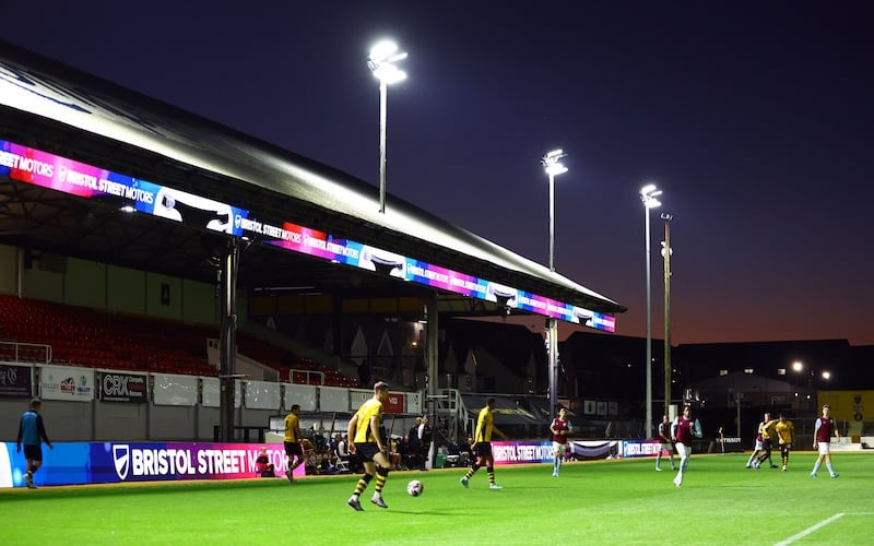 Evening football match at Bristol Street Motors stadium with players on the pitch under floodlights and digital advertising boards displaying 'BRISTOL STREET MOTORS', promoting used cars and new cars.