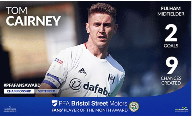 Tom Cairney has been voted the PFA Bristol Street Motors Fans Player of the Month for September by football fans across the country. In a vote run by fan engagement experts, Snack Media, the Fulham star won with 29% of the vote, beating Sheffield Wednesday s Steven Fletcher in second place with 22%.