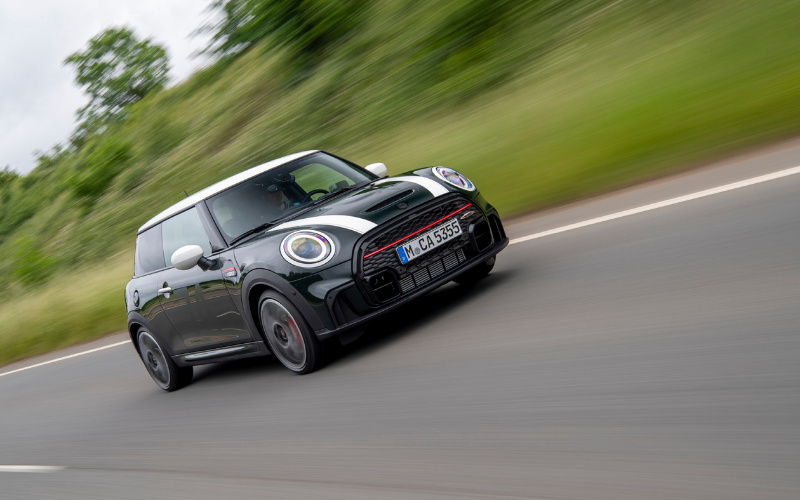 The new John Cooper Works Anniversary Edition is finished in Rebel Green with a contrasting white roof, door handles, mirror caps, headlight rings and bonnet stripes with a red accent line.