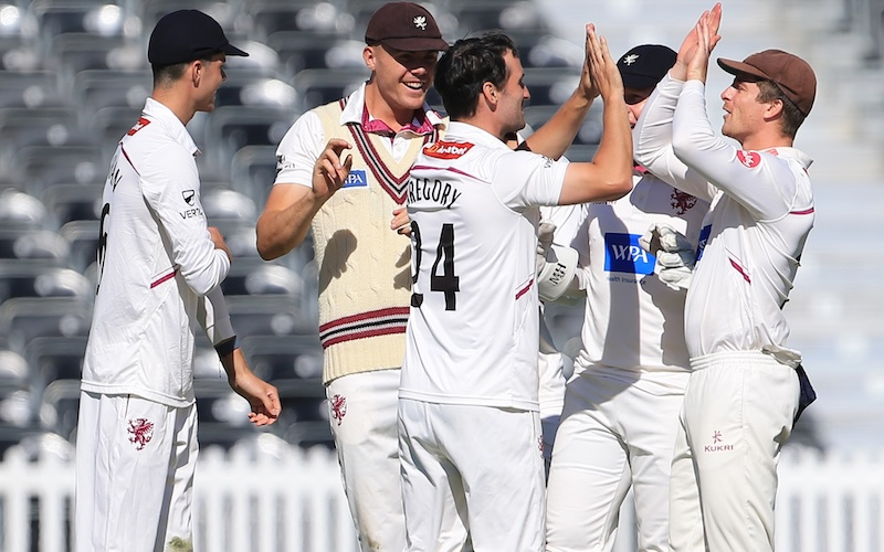 When Aldridge departed for a single, Somerset were six down and still 17 runs short of three figures but Gregory and Tom Abell steadied the ship slightly with a partnership of 34 before Abell departed for 22.