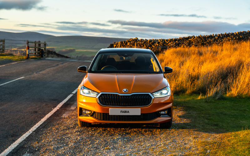 Front view of an orange Skoda Fabia car parked on a rural roadside with dry stone walls and golden grass under a cloudy sky, illustrating a new car model suitable for both used cars and new cars buyers.